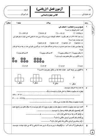 ✅نمونه سوال کلاس چهارم